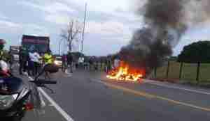 En Cáceres, Antioquia, tres personas que se movilizaban en dos motocicletas murieron incineradas tras impactar de frente.